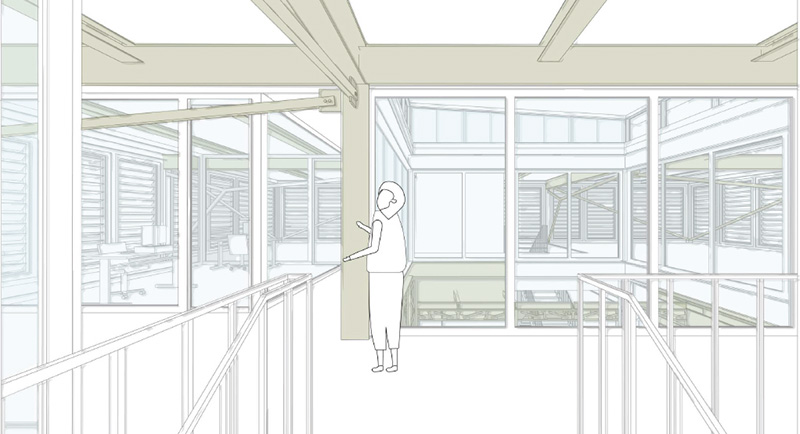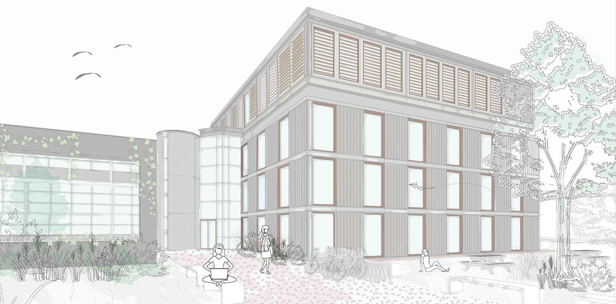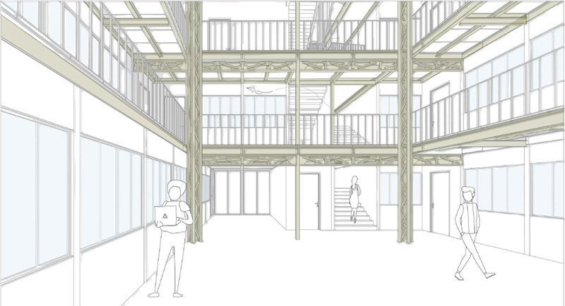 Architecturalement, le projet clarifie la lecture de la trame initiale, tout en améliorant les usages. Une triple hauteur centrale transforme le cœur du bâtiment A en puits de lumière. Des circulations généreuses révèlent la structure mise à nu. Le dernier niveau vitré accueille des espaces de travail modulables et réversibles, en rupture légère avec les étages inférieurs. La faisabilité constructive repose sur des principes rationnels : une superstructure indépendante, une ossature bois isolée en laine de roche et des panneaux de façade préfabriqués en acier galvanisé.