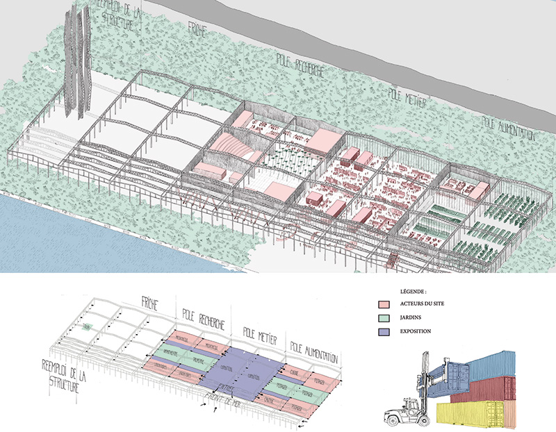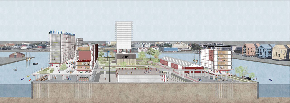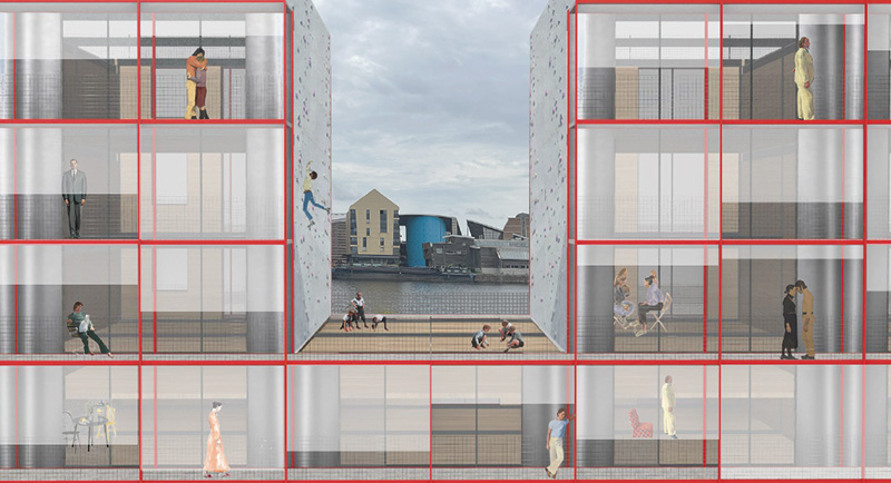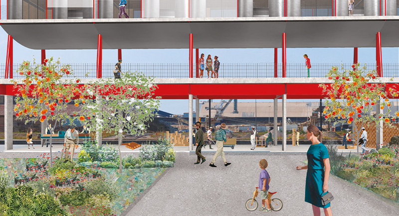Les programmes résidentiels, évolutifs et flexibles dans leur mixité typologique, reposent sur un socle massif, actif et productif avec une structure durable servant de base multifonctionnelle adressée sur le port. Sur ce socle, une promenade publique élevée à six mètres de hauteur relie et distribue les différents bâtiments. Des espaces communs s’insèrent dans la rigueur structurelle des logements et favorisent ainsi les échanges et le partage.