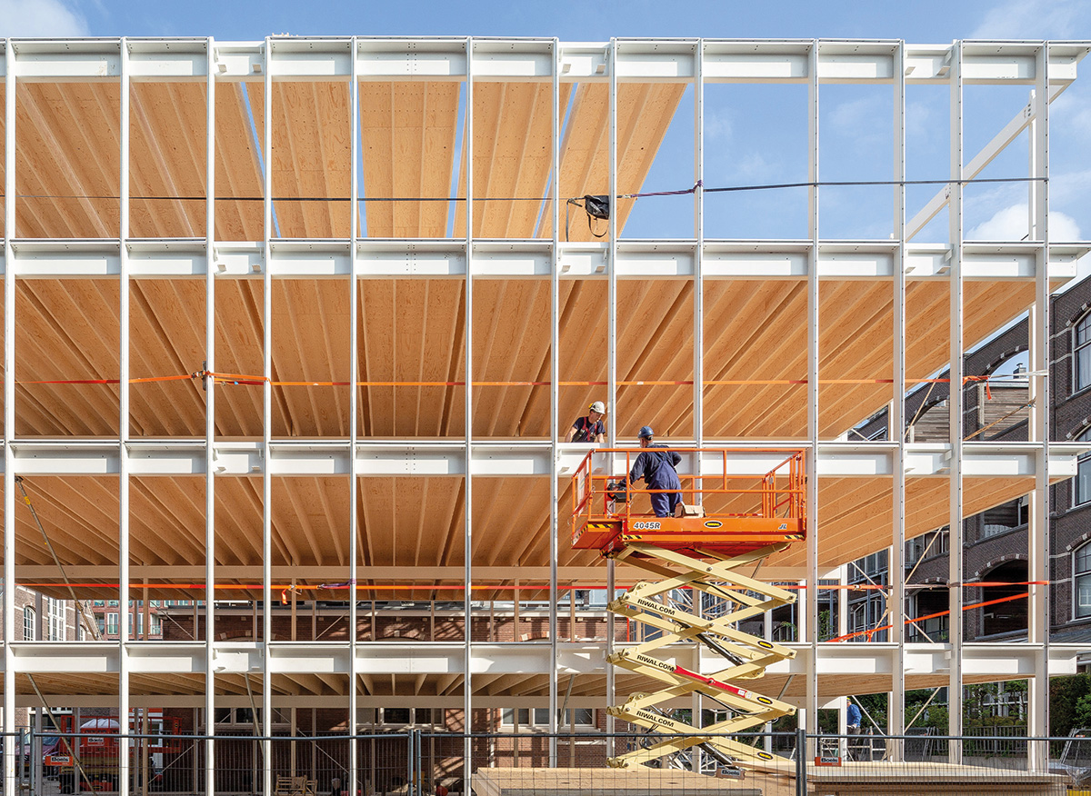 Implanté sur le site d’un ensemble de bâtiments historiques monumentaux, au centre de la ville de Delft, aux Pays-Bas, le bâtiment D(emountable) a été conçu en 2020 par l’agence Cepezed et édifié en seulement six mois. Le seul édifice en mauvais état et non monumental du lieu a été remplacé par cette nouvelle construction qui héberge plusieurs entreprises du secteur créatif, dont le bureau de l’agence Cepezed. Ce bâtiment – de 11 m de large et 21,50 m de long – est léger, flexible et neutre en énergie, et comprend 4 étages répartis sur 800 m² de surface totale. Outre le rez-de-chaussée réalisé en béton coulé, tous les composants de l’ouvrage sont modulaires et montés en filière sèche, de façon rapide et efficace. Mixité structurelle oblige, l’ossature principale se compose de fins profils en acier préfabriqués, durables et recyclables, et facilement assemblables in situ, tandis que les planchers et le toit sont dotés de panneaux légers en bois de placage stratifié, eux aussi préfabriqués. « J’ai été impressionné par la rapidité de l’assemblage, explique Jan Pesman, architecte et fondateur de l’agence Cepezed. La structure porteuse a été mise en place en à peine trois semaines. » En façade, l’édifice, d’expression épurée, ne possède pas de châssis de fenêtres, car le vitrage isolant à double couche est posé directement sur la structure métallique. Si des stores enrouleurs offrent une protection solaire adéquate aux façades, des lamelles verticales peuvent s’ouvrir pour garantir une ventilation naturelle aux espaces internes. Un projet particulièrement innovant, puisqu’il peut être démantelé et reconstruit ailleurs, à tout moment, selon une démarche d’économie circulaire performante.