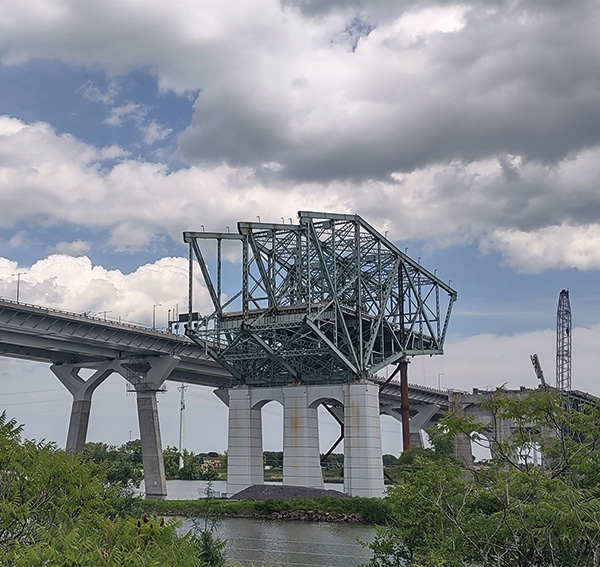 Franchissant le fleuve Saint-Laurent, le pont Champlain – du nom de Samuel Champlain, navigateur et explorateur français qui fonda la ville de Québec –, a été inauguré en 1962 pour relier les villes de Brossard et de Montréal. Devenu vétuste, il est fermé en 2019, tandis qu’un nouvel ouvrage, le pont Samuel-de-Champlain voit le jour peu après, à côté de l’existant. Le pont historique, de 3 440 m de long et 215,50 m de large, a été déconstruit de 2020 à 2023, par étapes, selon une approche de développement durable et une planification rigoureuse afin de minimiser l’impact sur l’environnement et favoriser le réemploi des matériaux. Un vrai défi technique, car il a fallu démanteler 200 000 tonnes de béton et 25 000 tonnes d’acier, sans contaminer le fleuve, l’énorme volume d’acier ayant été recyclé, récupéré ou réemployé.