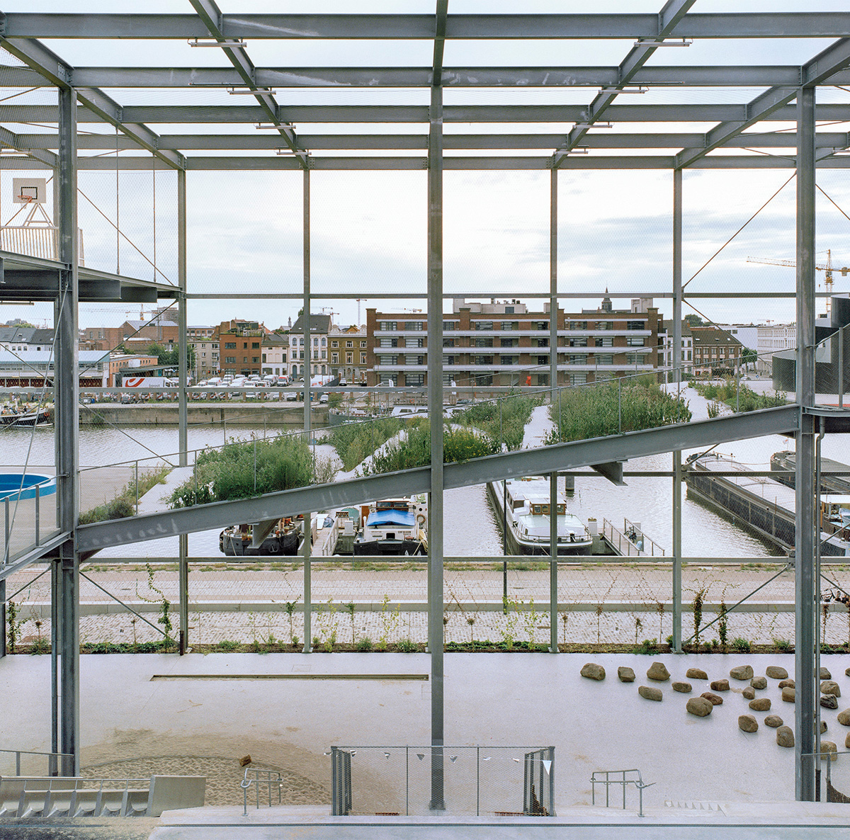 Dans le quartier des anciens docks (Oude Dokken) de Gand, en Belgique, en requalification urbaine depuis plus de 15 ans, et le long du quai des Bateliers (le Handelsdok), prend place le bâtiment Mélopée, imaginé par l’architecte Xaveer De Geyter (XDGA) en 2020. Cet équipement multifonctionnel de 4 630 m² regroupe une crèche, une école primaire, une garderie périscolaire et un centre sportif de quartier. Au rez-de-chaussée, se déploient la crèche et les locaux de la direction, et au premier étage, le réfectoire de l’école et la salle de sports. « Comme nous n’avions pas assez de surface pour organiser ces installations, nous les avons empilées les unes au-dessus des autres pour créer un espace extérieur très théâtral qui donne sur la ville », décrit Xaveer De Geyter. Ce parti architectural audacieux, assorti d’un concept d’école atypique, a conduit à mettre en œuvre une fine structure métallique porteuse ouverte, qui intègre et superpose les différents terrains de jeux. Lesquels sont associés à un édifice compact et rationnel (30 x 40 m) implanté sur le côté est du site. Si les colonnes d’acier sont réparties, selon une grille géante de 4 x 5 m, afin de limiter la portée et réduire l’épaisseur des dalles béton à 15 cm, l’ensemble des façades a reçu un mur rideau toute hauteur tramé.