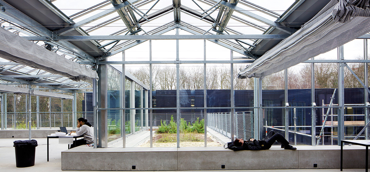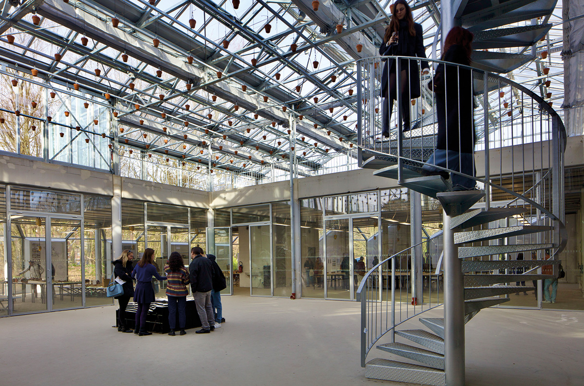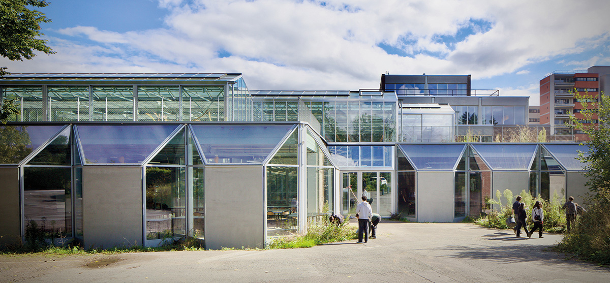 métal-verre au cœur du monument Unesco pour produire nos propres plants de légumes en circuit court, étendre la période de production, et la diversifier au profit d’une alimentation saine et durable pour les groupes scolaires qui se restaurent à la Saline royale. Les principes du bioclimatisme ont ici été appliqués pour favoriser l’ensoleillement, l’accumulation de chaleur, l’inertie thermique et l’usage cyclique de l’eau. Afin de renforcer la capacité d’adaptation face au dérèglement climatique, une structure en forme de zome (résistance aux vents violents, répartition équilibrée de la lumière pour les végétaux) a été construite, inspirée de l’héritage de l’architecte de la Saline royale au xviiie siècle, Claude-Nicolas Ledoux.