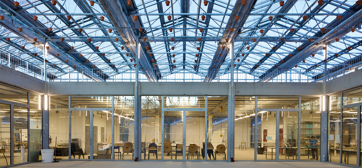 Le bâtiment superpose géométrie de haute précision, permissivité de hangar et imaginaire de feuilleton. Sa charpente en profilé tubulaire dessine un objet à la fois technique et enfantin, simple et complexe, utile et beau.