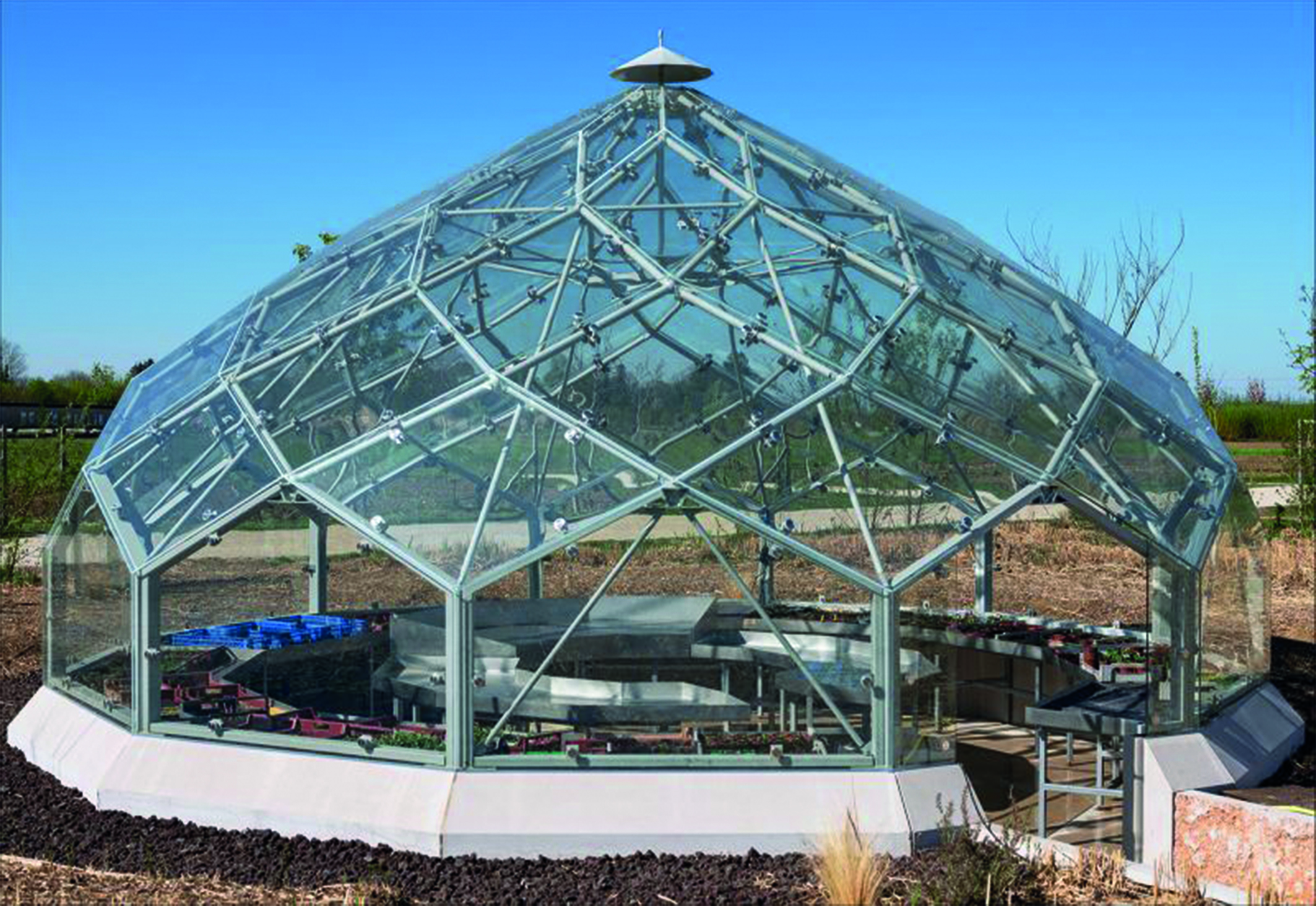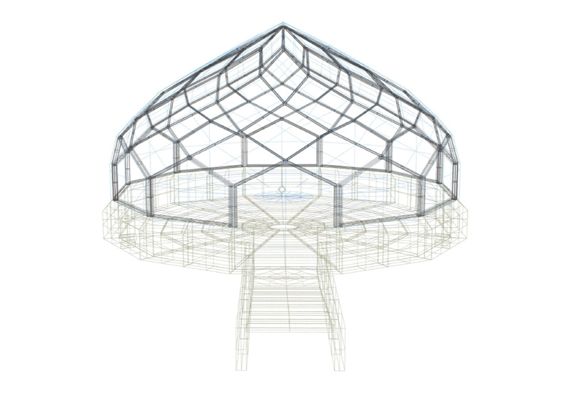 L’acier forme l’ossature de la coupole par le biais de losanges soudés sur des sphères et regroupés par spirales successives sur un « berceau » (une contreforme préparée au sol de l’atelier et reprenant les positions tridimensionnelles exactes des sphères). Ce mode d’assemblage – une prouesse constructive, puisque les zomes sont généralement structurés en bois et assemblés losange par losange – a permis de dresser la coupole par la solidarisation de six spirales, connectées entre elles par des entretoises. Le squelette d’acier est stabilisé à l’intérieur par un jeu de jambes de force et de roues servant également de système d’accroche pour l’arrosage et les voiles de culture.