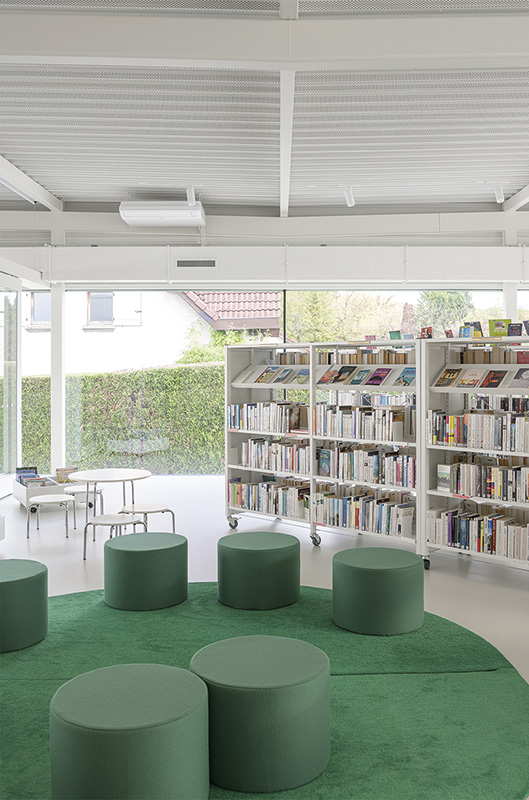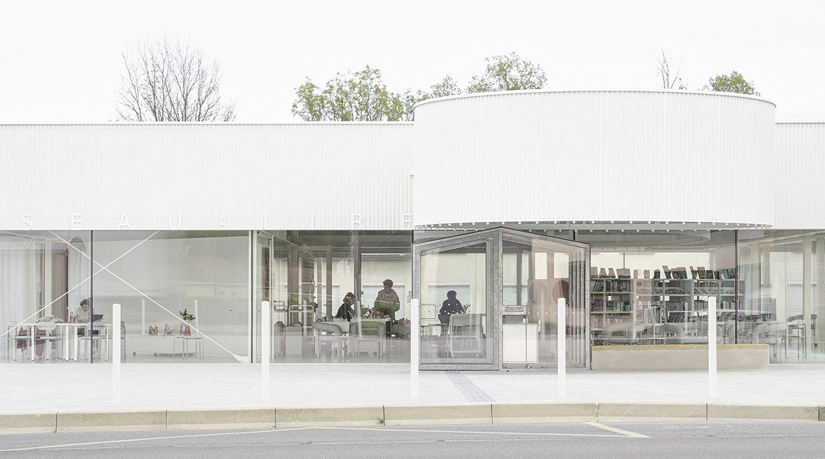 La médiathèque se situe en frange du village le long de la RN. Dans ce contexte ambigu, totem, parking, parvis et vitrine attirent le chaland vers la culture en libre-service dans une station-service publique. Elle emprunte au type la charpente métallique efficace, le blanc, l’économie de moyens, le mutisme : une couverture carrée abritant un plan vide qui accueille le paysage changeant des collections et des usagers qui les pratiquent. Elle emprunte aussi au modèle commercial sa signalétique hypertrophique et pop : une marquise cylindrique et une maisonnette en verre qui désignent l’accès, un auvent circulaire qui abrite le préau de la cour d’école limitrophe. L’usage de l’acier est d’abord contextuel, issu directement du modèle culturel qui a inspiré le projet en réponse à son environnement. Il se décline dans cette même logique en structure (portiques et contreventement, marquise en porte-à-faux), enveloppe (plateau de bardage et bac support d’étanchéité perforés, menuiserie), bardage extérieur (petite onde), partitions intérieures modulaires (panneaux coulissants), signalétique (totem et lettrage). L’acier assure donc à la fois stabilité, finesse, économie, rapidité, confort thermique et acoustique, visibilité, ambiance, flexibilité.