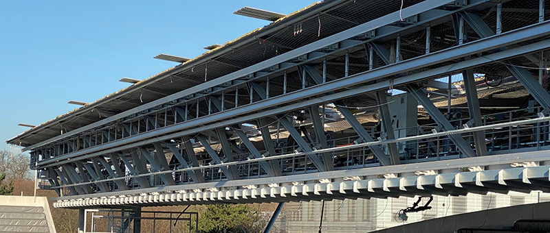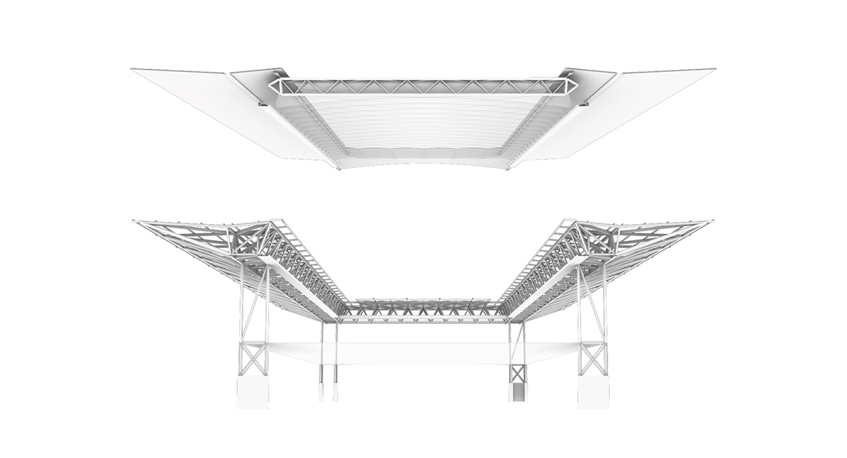La partie mobile, composée d’une membrane et câbles tendus, couvre plus de 4 200 m² sans aucun élément de structure rigide. Cette légèreté est atteinte grâce à la résistance de la structure fixe en périphérie : une charpente métallique reposant sur quatre palées contreventées. Les poutres principales nord-sud, portant près de 100 m, sont formées de treillis tridimensionnels en profils acier ouverts. Cette superstructure, d’environ 1 000 tonnes, a été assemblée au sol, puis ripée en position finale au-dessus des tribunes en porte-à-faux. L’empreinte carbone du projet a été minimisée par le recours systématique aux acier recyclés, et la traçabilité poussée jusqu’aux usines sidérurgiques spécifiques. Le nouvel ouvrage est relié à l’existant par une maille métallique poreuse adoucissant les effets du vent et de la pluie tout en conservant un classement ERP de plein air. Le projet est entièrement visible du public, la technique forme architecture. Charpente, mécanismes et toile sont dessinés, assumés et peuvent être contemplés en fonctionnement par l’ensemble des spectateurs.