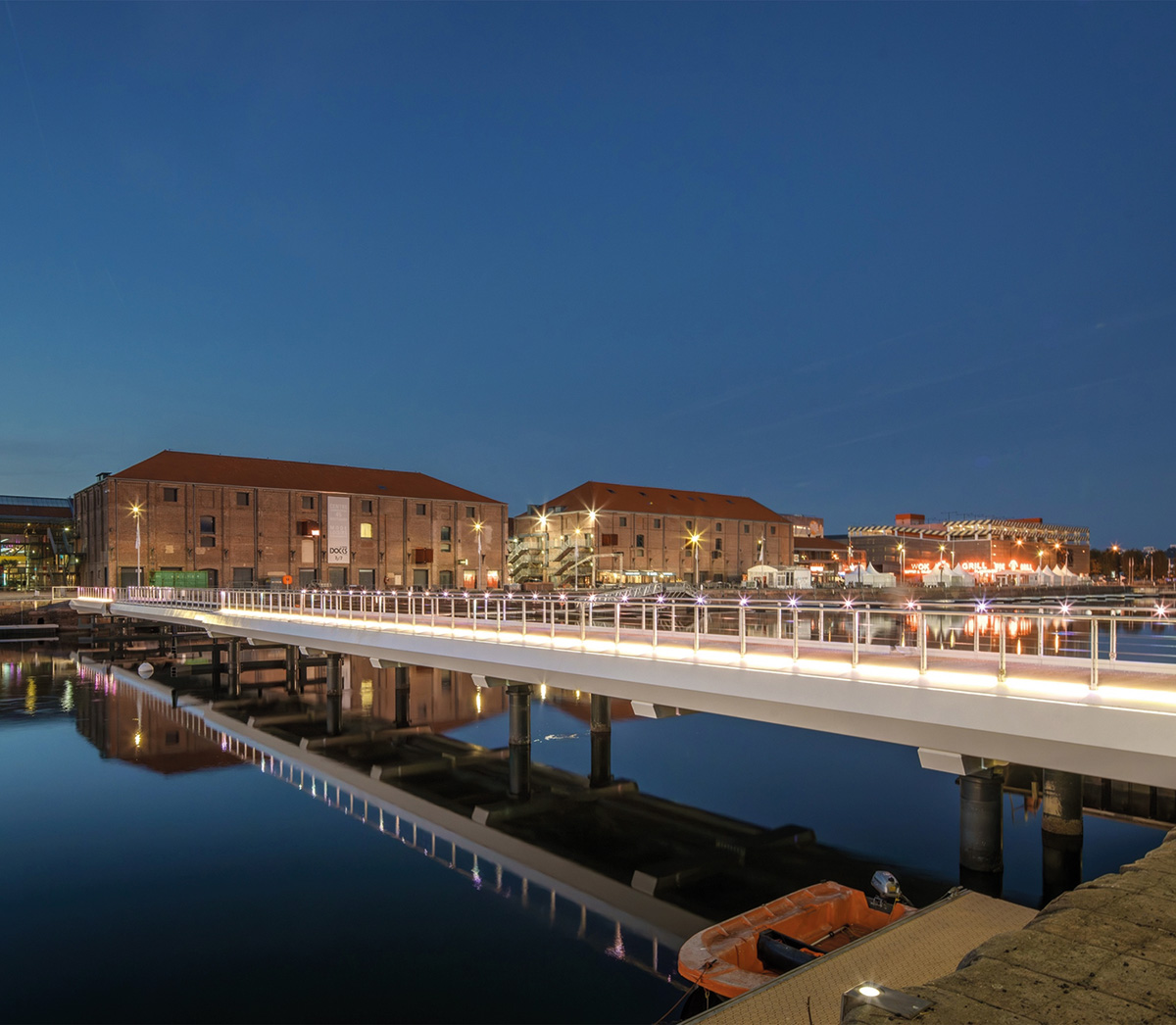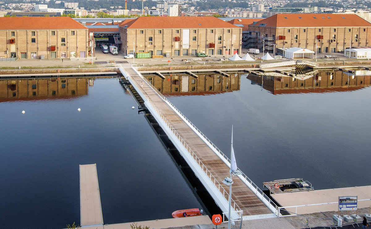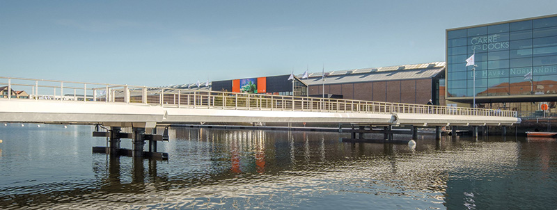 La passerelle mobile Daniel Colliard franchit le bassin Paul Vatine, situé dans le quartier des docks, au Havre. En position fermée, elle crée un accès piéton direct vers les nouveaux aménagements des docks. En position ouverte, elle ouvre la circulation aux navires, en particulier les voiliers de la Transat Café L’Or (nouveau nom de la Transat Jacques Vabre). Les éléments fixes se transforment alors en belvédère, offrant aux usagers des vues privilégiées sur les voiliers. Le système mobile, unique au monde, est constitué de deux éléments distincts : le premier tablier (ou tiroir) se déplace horizontalement pour franchir la passe de 25 m ; le deuxième tablier (ou plateau) monte verticalement pour remplacer le tiroir lorsque celui-ci ferme la passe. Les éléments mobiles s’intègrent dans le tablier pour ne laisser visible qu’un trait fin sur le bassin, sans aucune superstructure. L’ouvrage disparaît ainsi dans le paysage horizontal et minéral du bassin Paul Vatine. L’extrême compacité des éléments structurels et mécaniques n’a été rendue possible que par l’utilisation systématique de l’acier. En particulier, les tabliers mobiles, les galets et les rails de roulement, ainsi que les poutres latérales enveloppes ont impliqué des nuances d’acier à très hautes performances. La précision requise pour les éléments mécaniques de roulement, proche de l’horlogerie, a nécessité d’abaisser les tolérances de fabrication de la charpente métallique, bien au-delà des exigences requises pour un ouvrage d’art classique.