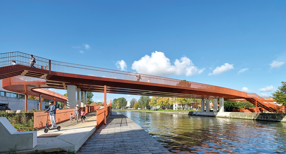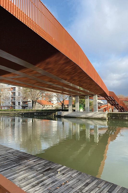 Le franchissement s’inscrit dans la mise en accessibilité du Stade de France pour les Jeux de Paris 2024 et dans les aménagements du canal Saint-Denis. Plutôt que de démolir deux ouvrages – le pont mobile et la passerelle non accessible –, nous avons opté pour une démarche vertueuse : réemployer le tablier du pont mobile et une partie de ses fondations. Cette solution réduit l’impact environnemental et limite les déchets de démolition. L’absence d’ascenseurs impose de longues rampes dont l’insertion urbaine et paysagère constitue un enjeu majeur. Ce type d’ouvrage, souvent perçu comme un obstacle, a ici été conçu avec soin pour préserver les perspectives et les usages. Le projet conjugue les contraintes du gabarit fluvial et de la présence d’un émissaire, avec l’opportunité d’un tablier existant réemployé aux dimensions avantageuses, difficilement envisageables sur un ouvrage neuf. La passerelle n’est pas pensée comme un geste architectural, mais comme une promenade d’une rive à l’autre, un dispositif qui active le paysage urbain. Les rampes reçoivent le même soin architectural que le franchissement lui-même. Le garde-corps en applique assure une cohérence visuelle entre l’existant et les ajouts. Ce projet incarne une approche durable, respectueuse des contraintes techniques et de l’histoire du site, et vise à faire de ce franchissement un symbole d’engagement écologique et de résilience urbaine.