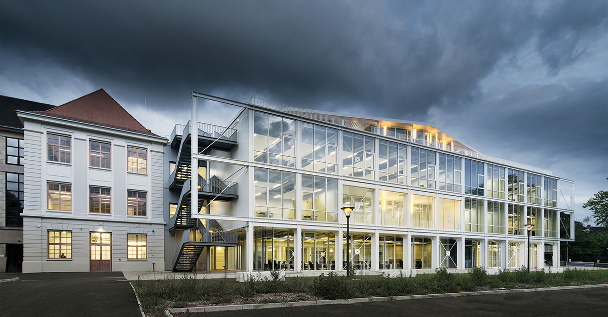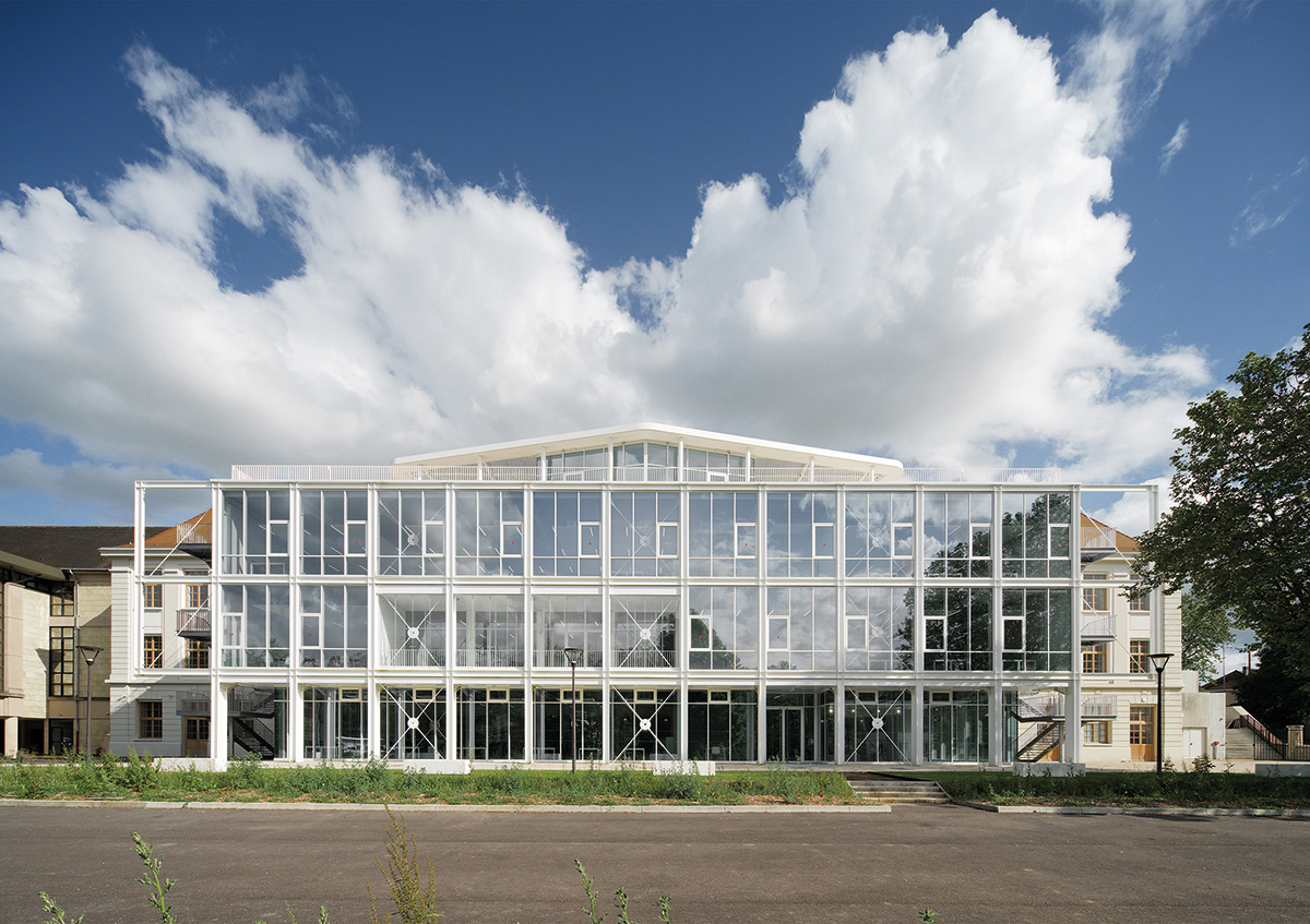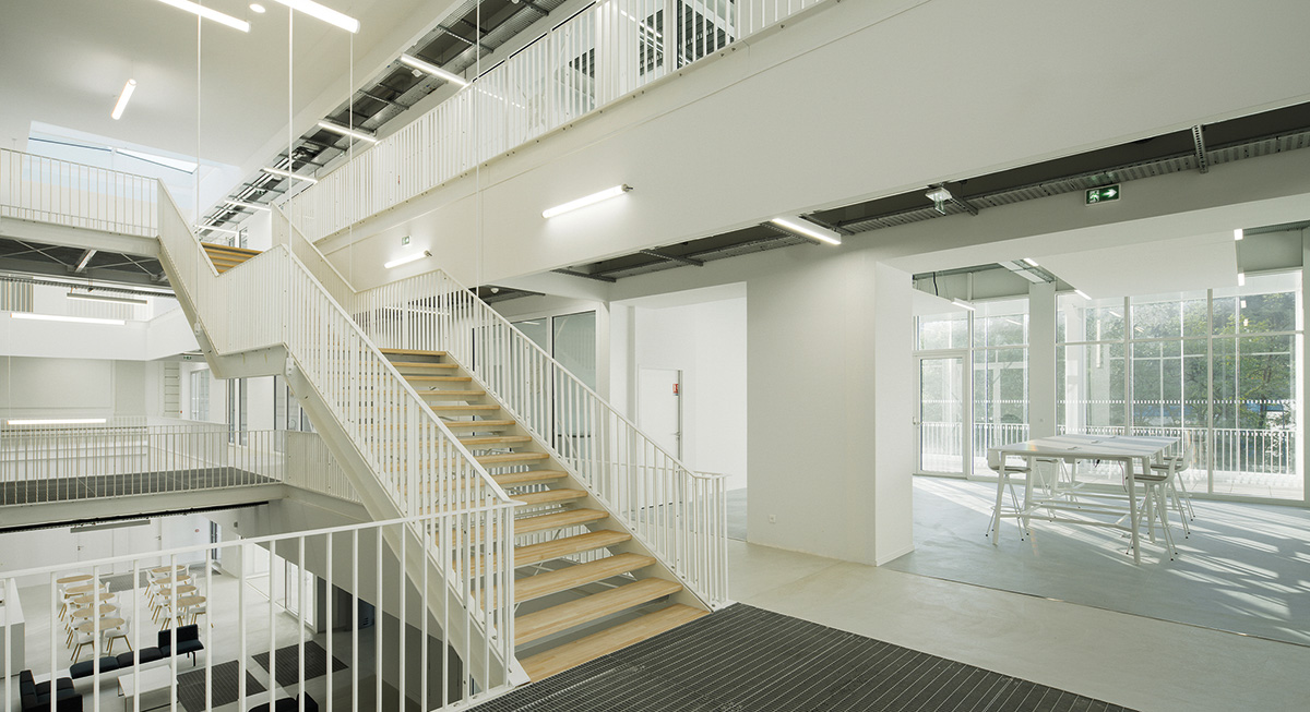 Le statut de cet équipement, dédié à l’accompagnement de projets innovants, doit ainsi être clairement exprimé à travers une image contemporaine et dynamique, tout en s’insérant harmonieusement dans son contexte. L’inscription de l’extension – structure de grands portiques métalliques habillés de murs rideaux vitrés – et son interrelation avec l’ancien lycée constituent en effet un enjeu majeur pour la conception d’une « vitrine de l’innovation » de la Communauté urbaine Creusot-Montceau. Le projet s’appuie sur les éléments remarquables du site, dont l’ancien lycée et le grand paysage. Il développe un large parvis au sud tourné vers la ville, que souligne l’apparence monumentale du bâtiment existant, tandis que le volume de l’extension s’ouvre largement au nord, vers le paysage de Vallon et le campus. Dans l’entre-deux ainsi créé, le projet développe un grand espace central mutualisé innervant l’ensemble des locaux et devenant un point de passage obligé. La structure est particulièrement mise en valeur dans cet atrium, notamment par la présence de passerelles, d’un escalier métallique suspendu, de la répétition des croix de Saint-André déployées en façade… Cette structure métallique de l’extension permet d’établir ainsi un dialogue fécond entre patrimoine et modernité, de même qu’elle exprime une architecture du lien : comme un symbole de la vocation de cet équipement, qui se veut propice à édifier des ponts entre les acteurs et les disciplines pour tendre vers l’innovation.
