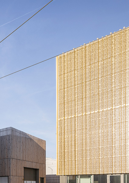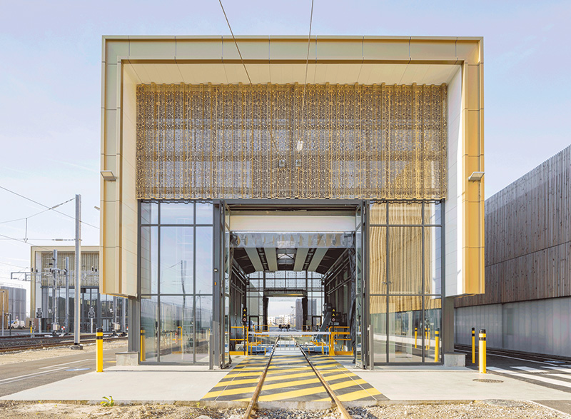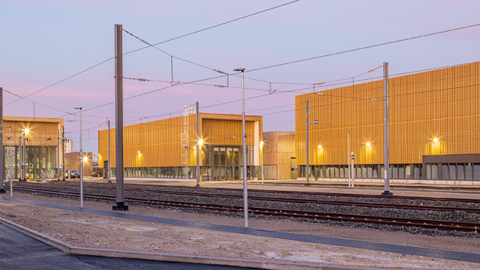 Imposant, le technicentre s’inscrit dans le paysage grâce à une fragmentation maîtrisée des volumes et à la diversité des textures métalliques. Les variations de teintes, les jeux de résilles et le recours ponctuel au bois contribuent à adoucir la silhouette de l’édifice. L’ensemble renvoie l’image d’un outil industriel contemporain, fonctionnel et cohérent avec les objectifs de transformation du secteur Val-Notre-Dame. La composition des façades et l’architecture des bâtiments sont destinées à valoriser l’apport de lumière naturelle aux différents postes de travail, et ce, sur tout le linéaire. Des lanterneaux et sheds filants en toiture s’associent aux façades revêtues d’un bardage métallique plein, doublé d’une résille semi-transparente perforée et de teinte dorée. Cette seconde peau assure le rôle de filtre solaire, apporte confort thermique et pérennité à l’enveloppe. Dans le même temps, sa texture plissée accroche la lumière, anime les volumes et porte l’identité du projet.
